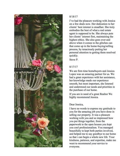 "Jessica Lopez is the most hard working, dependable, knowledgeable agent I have ever worked with. She goes above and beyond to satisfy her clients to the best of her ability. It was such a pleasure working with Jessica throughout my first time buyer experience and she never gave up on me and my family. I highly recommend Jessica to anyone searching or selling homes. Thank you Jessica for all you did for me and my family! We need more agents like you out there! I will definitely contact you again for my future search for homes!" Jennifer C.